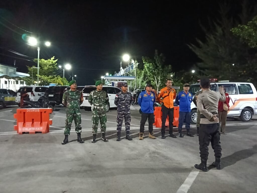 Personel terlibat kegiatan malam ini, TNI 3 Orang, Polri 6 Orang, Nakes 2 Orang, Dishub 4 Orang, Satpol PP 2 Orang, Damkar 2 Orang, Basarnas 2 Orang, dengan Lokasi Pelabuhan Roro Air Putih, Kecamatan Bengkalis.
