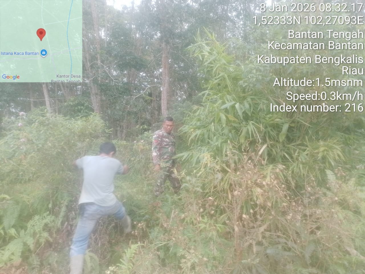 BENGKALIS- Posramil Bantan Koptu Dedi Swarman dan 1 orang masyarakat melaksanakan Patroli dan Sosialisasi Karhutla (Kebakaran hutan dan lahan) di Desa Bantan Tengah Kecamatan Bantan Kabupaten Bengkalis, Kamis (08/01/2026) pukul 10.00 Wib.